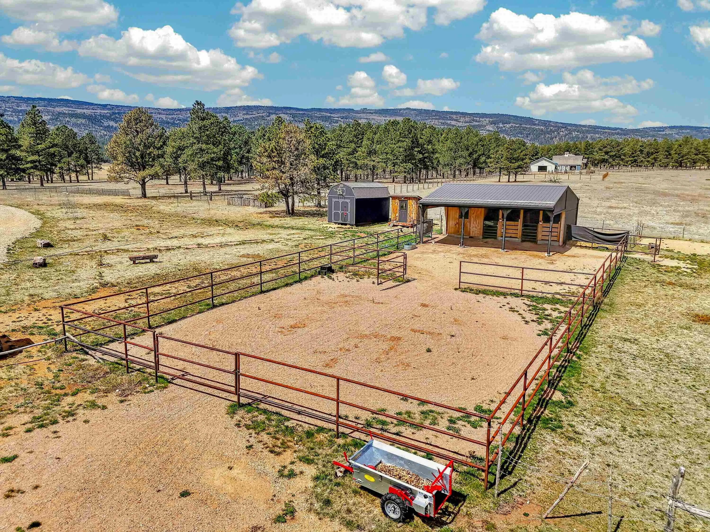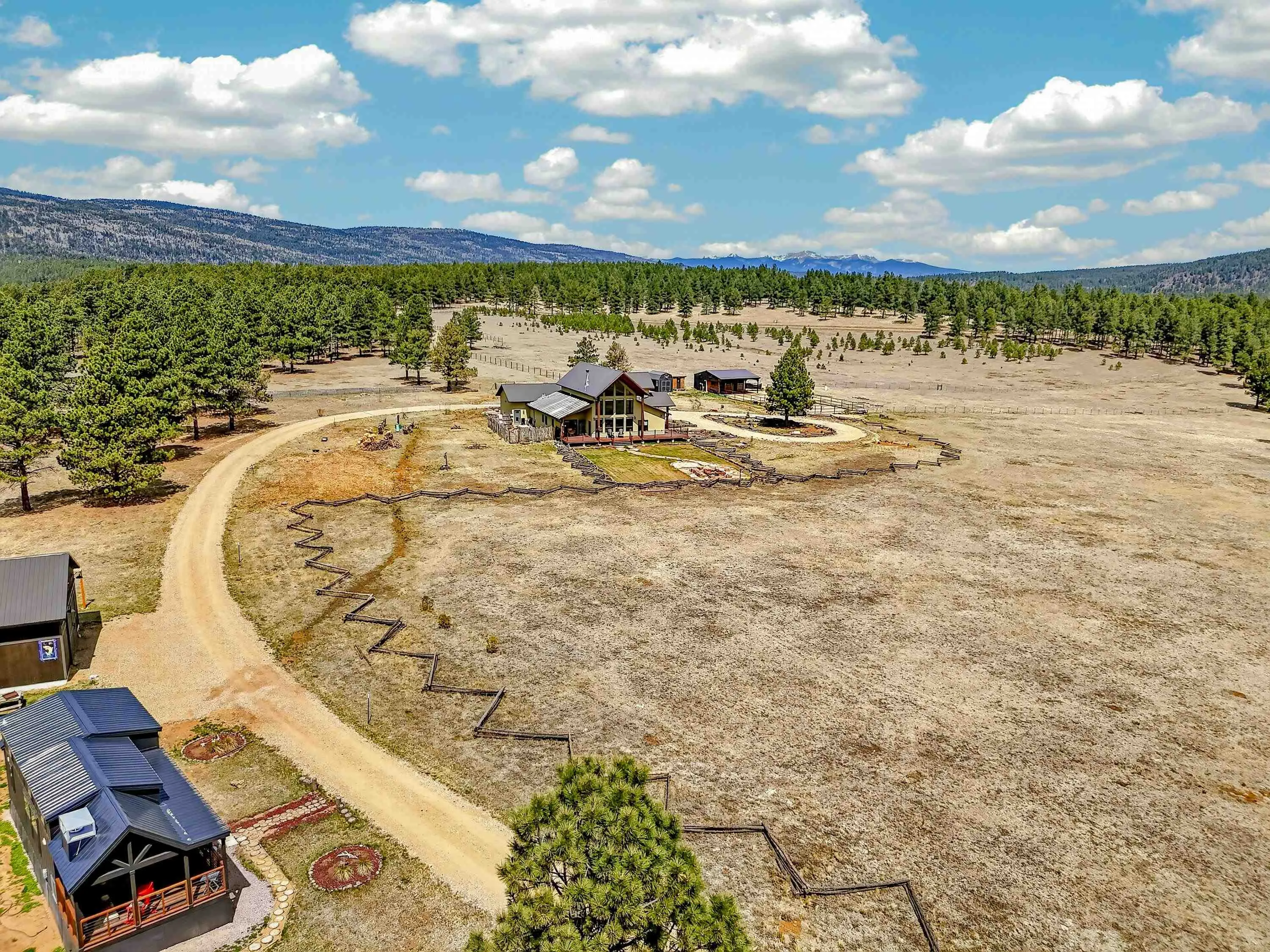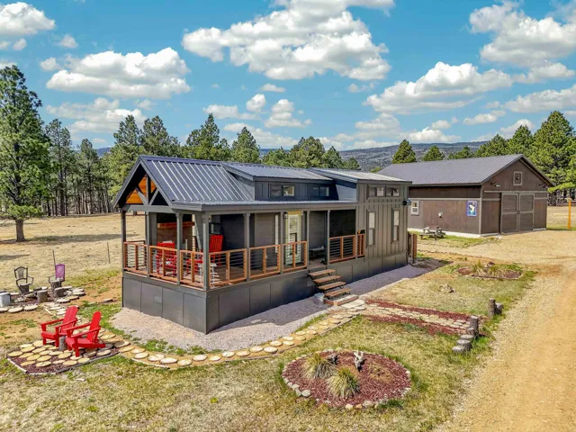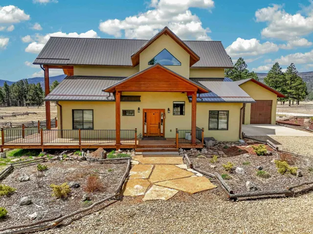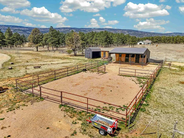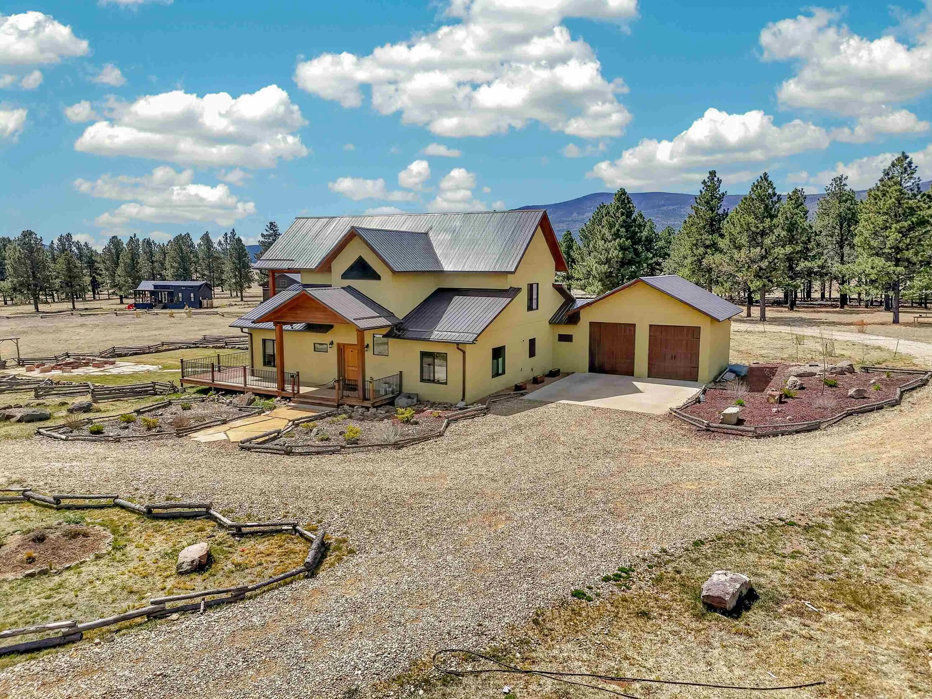 23 Acre Horse Property with Custom Home & Stunning Views Enjoy the perfect blend of mountain living and equestrian functionality just minutes from Angel Fire Resort. Set on 23 fully fenced, usable acres, this thoughtfully designed property offers privacy, open space with sweeping valley and mountain views—ideal for horse owners, outdoor enthusiasts or anyone seeking a peaceful year-round retreat. Entering through the handcrafted timber ranch gate and following the improved private driveway, you’ll find a beautiful custom-built home. Inside, travertine tile with marble inlay and in-floor radiant heat create a warm and inviting first impression. The open-concept living, kitchen and dining areas are filled with natural light from a dramatic wall of windows and anchored by a massive stone fireplace. Soaring 30-foot ceilings lead to a loft with expansive views, adding to the home’s spacious feel. The kitchen is both functional and refined, featuring Kenmore Elite appliances, a copper farmhouse sink, granite countertops, wormy maple accents and custom cabinetry. All three bedrooms are conveniently located on the main level, including a spacious primary suite with French doors opening to a covered deck. The ensuite bath offers a clawfoot soaking tub, walk-in shower and walk-in closet. The oversized 2-car garage also features in-floor radiant heat. Designed for equestrian use, the property is a fully equipped horse setup with steel pipe fencing, two 50’x50’ paddocks, cross-fenced pastures and hotwire fencing throughout. The 15’x35’ shed-row barn includes adjustable stalls (1–3), a Dutch-door tack and feed room with heat, on-demand propane hot water, utility sink, and electricity inside and out. A 15’x35’ overhang provides additional shelter, complemented by a hay barn with loft, water lines, electric access for trough heaters and a designated gated manure composting area. Additional property features include a 1,200 sq ft workshop with loft, water, and electricity, a dedicated RV pad with 30-amp service and multiple outbuildings offering flexibility for storage, hobbies, or future expansion. A newly added 2025 tiny house casita (1 bedroom, 1 bath plus loft) includes its own deck, outdoor fireplace, separate septic, electric, water, and fiber optic internet—ideal for guests or potential rental use. Recent upgrades include a new Generac whole-home generator (2025) connected to an owned 10,000-gallon underground propane tank, fire-wise tree thinning, new gutters and snow breaks, exterior re-staining, an updated laundry room, and extensive landscaping with native plants, drip irrigation, stone walkways and natural boulder accents. Offered fully furnished with no HOA or resort dues. This is a rare opportunity to own a turn key equestrian mountain property offering space, privacy, and exceptional versatility.
