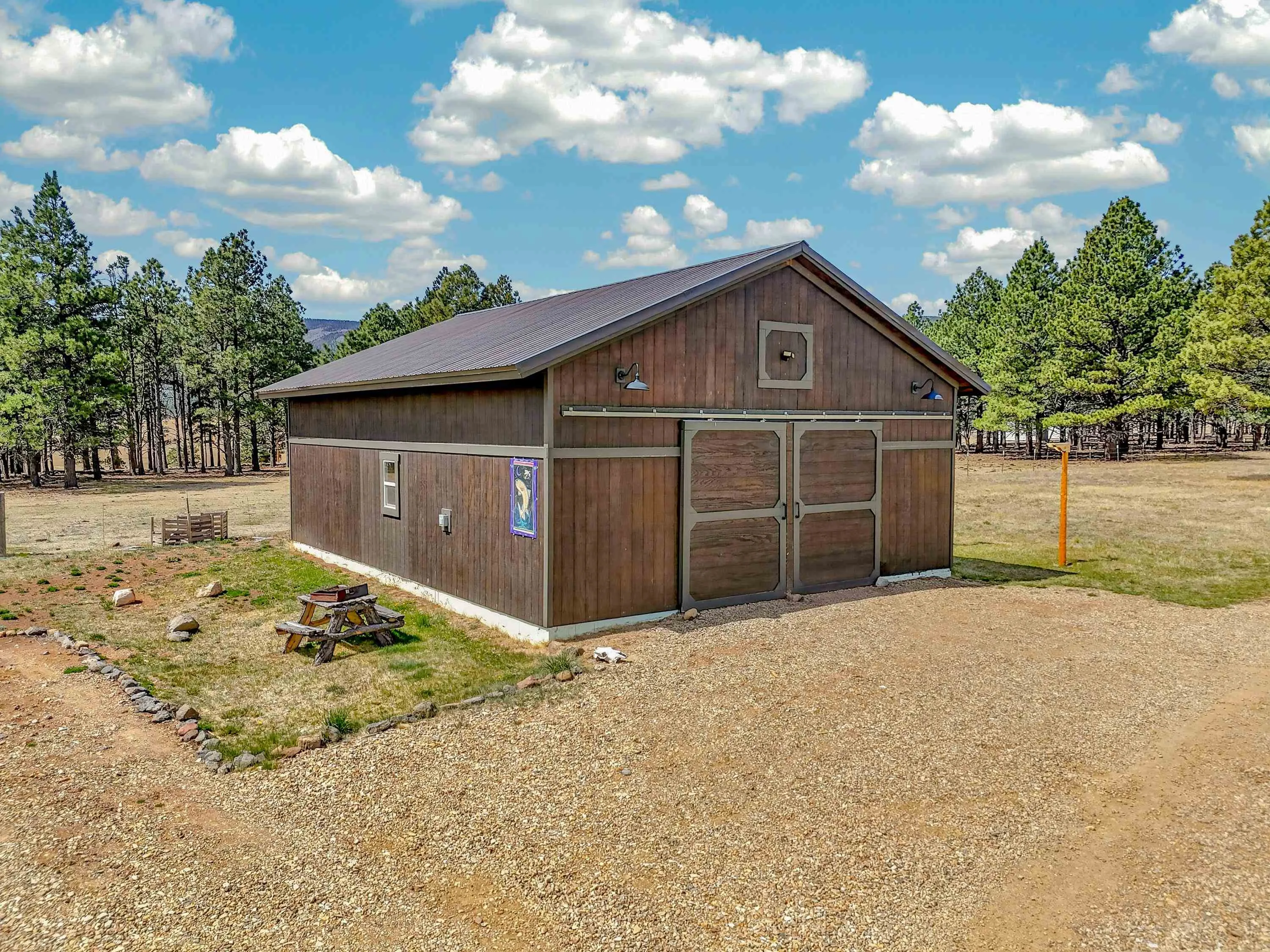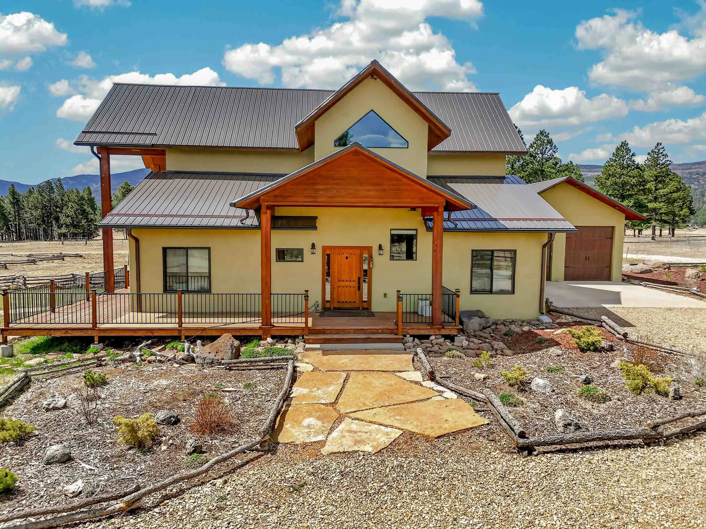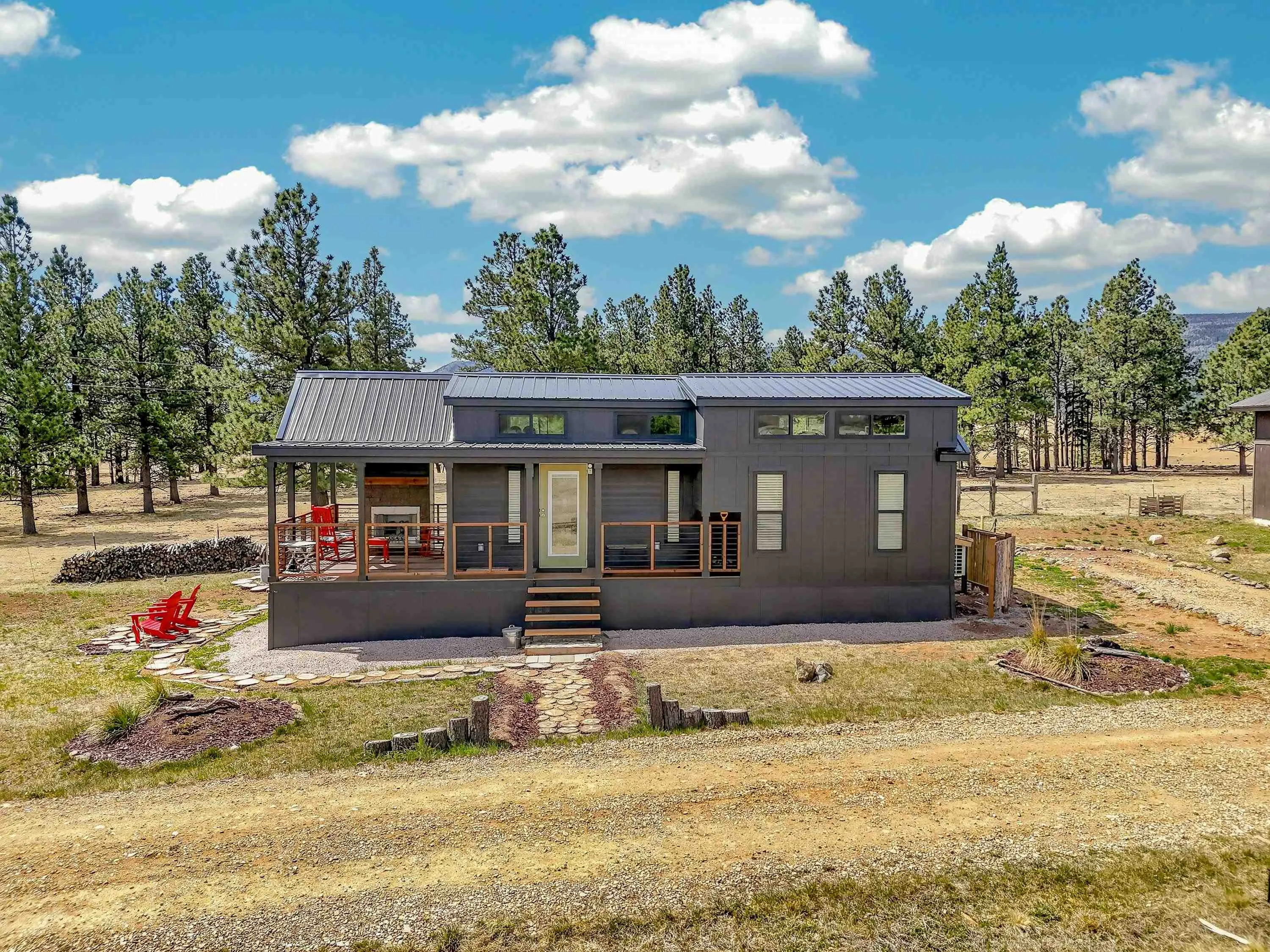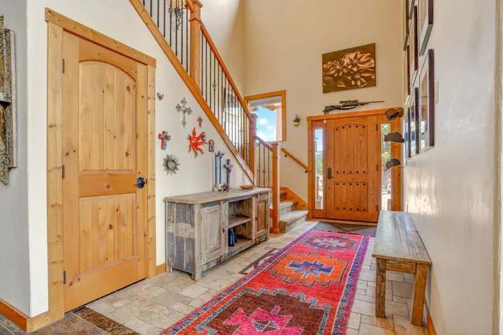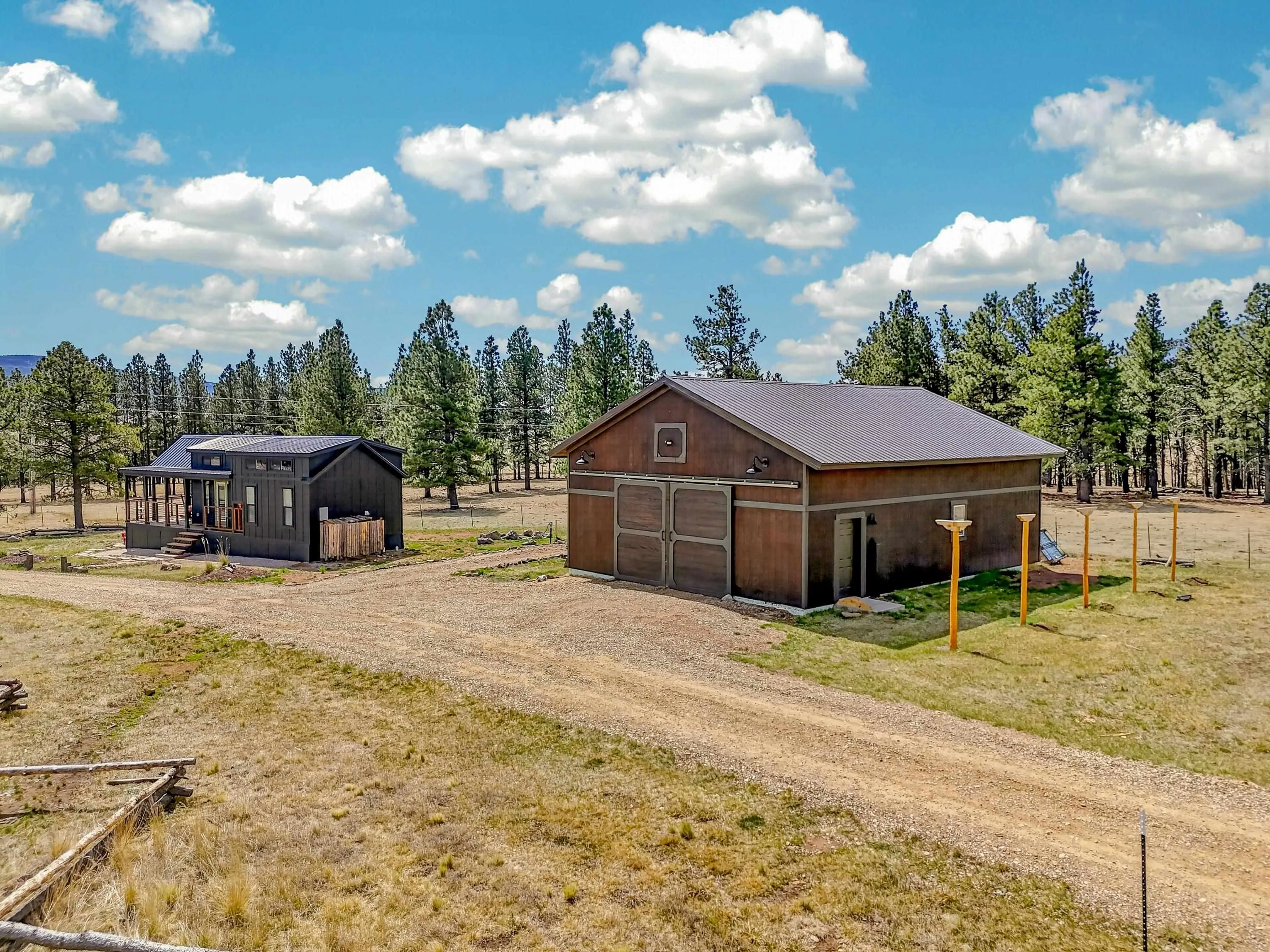 23 Acre Horse Property with Custom Home & Stunning Views Enjoy the perfect blend of mountain living and equestrian functionality just minutes from Angel Fire Resort. Set on 23 fully fenced, usable acres, this thoughtfully designed property offers privacy, open space with sweeping valley and mountain views—ideal for horse owners, outdoor enthusiasts or anyone seeking a peaceful year-round retreat. Entering through the handcrafted timber ranch gate and following the improved private driveway, you’ll find a beautiful custom-built home. Inside, travertine tile with marble inlay and in-floor radiant heat create a warm and inviting first impression. The open-concept living, kitchen and dining areas are filled with natural light from a dramatic wall of windows and anchored by a massive stone fireplace. Soaring 30-foot ceilings lead to a loft with expansive views, adding to the home’s spacious feel. The kitchen is both functional and refined, featuring Kenmore Elite appliances, a copper farmhouse sink, granite countertops, wormy maple accents and custom cabinetry. All three bedrooms are conveniently located on the main level, including a spacious primary suite with French doors opening to a covered deck. The ensuite bath offers a clawfoot soaking tub, walk-in shower and walk-in closet. The oversized 2-car garage also features in-floor radiant heat. Designed for equestrian use, the property is a fully equipped horse setup with steel pipe fencing, two 50’x50’ paddocks, cross-fenced pastures and hotwire fencing throughout. The 15’x35’ shed-row barn includes adjustable stalls (1–3), a Dutch-door tack and feed room with heat, on-demand propane hot water, utility sink, and electricity inside and out. A 15’x35’ overhang provides additional shelter, complemented by a hay barn with loft, water lines, electric access for trough heaters and a designated gated manure composting area. Additional property features include a 1,200 sq ft workshop with loft, water, and electricity, a dedicated RV pad with 30-amp service and multiple outbuildings offering flexibility for storage, hobbies, or future expansion. A newly added 2025 tiny house casita (1 bedroom, 1 bath plus loft) includes its own deck, outdoor fireplace, separate septic, electric, water, and fiber optic internet—ideal for guests or potential rental use. Recent upgrades include a new Generac whole-home generator (2025) connected to an owned 10,000-gallon underground propane tank, fire-wise tree thinning, new gutters and snow breaks, exterior re-staining, an updated laundry room, and extensive landscaping with native plants, drip irrigation, stone walkways and natural boulder accents. Offered fully furnished with no HOA or resort dues. This is a rare opportunity to own a turn key equestrian mountain property offering space, privacy, and exceptional versatility.