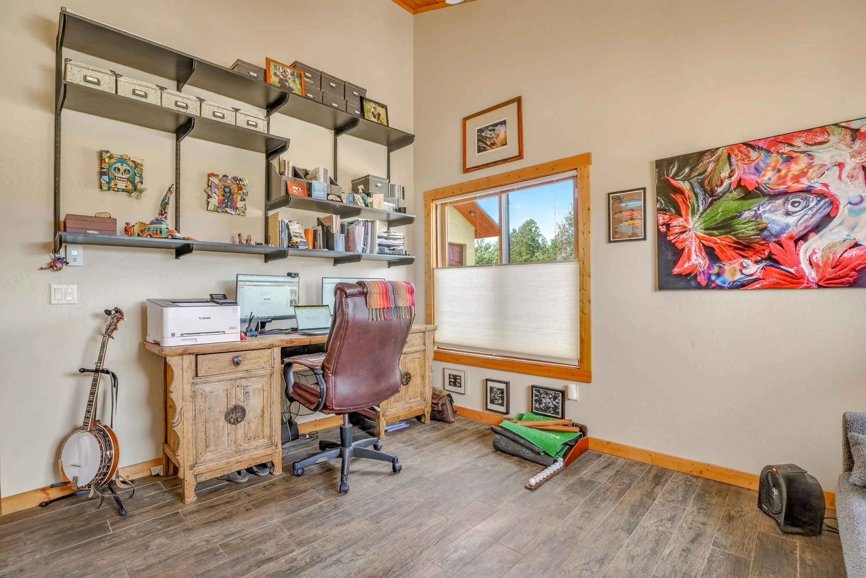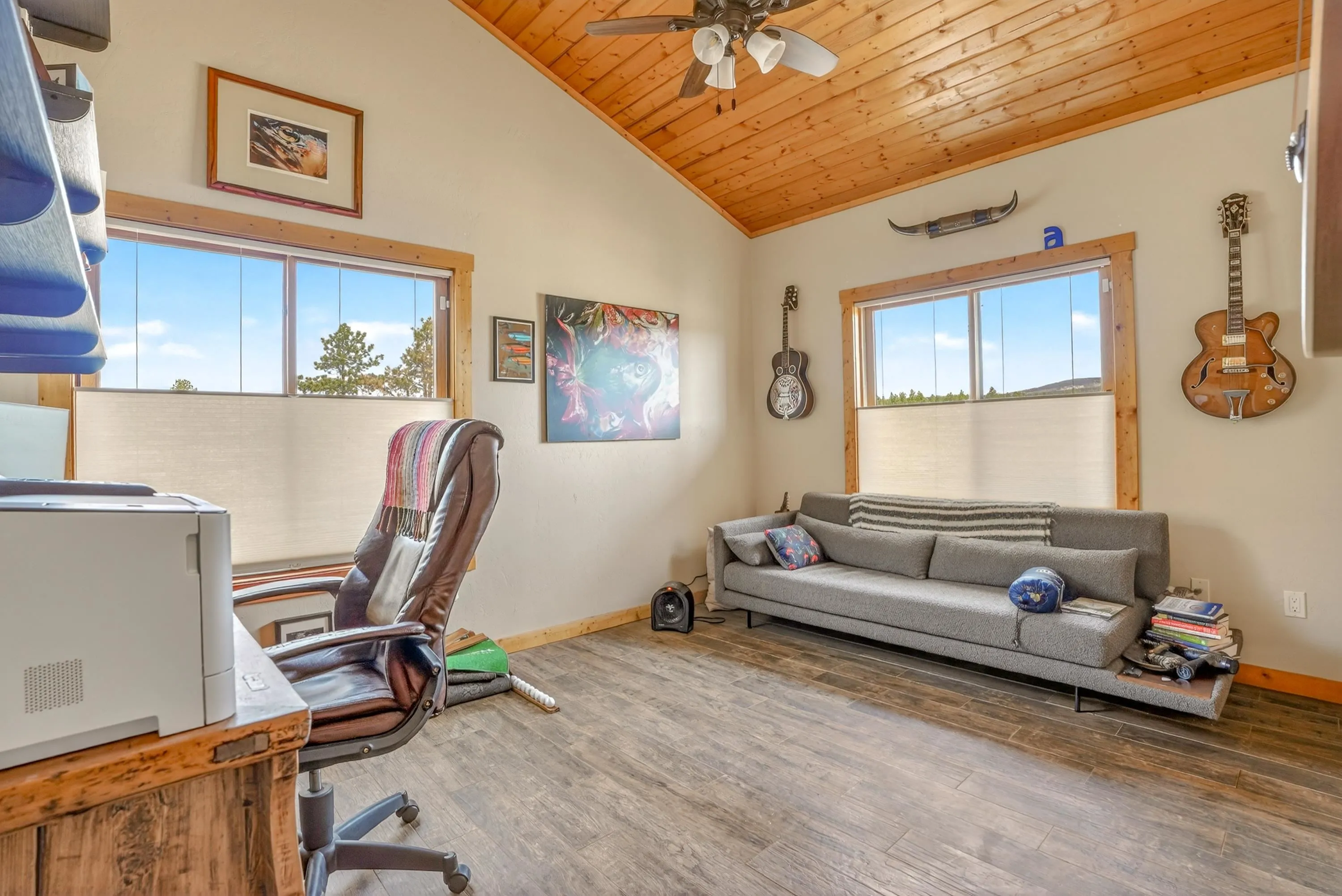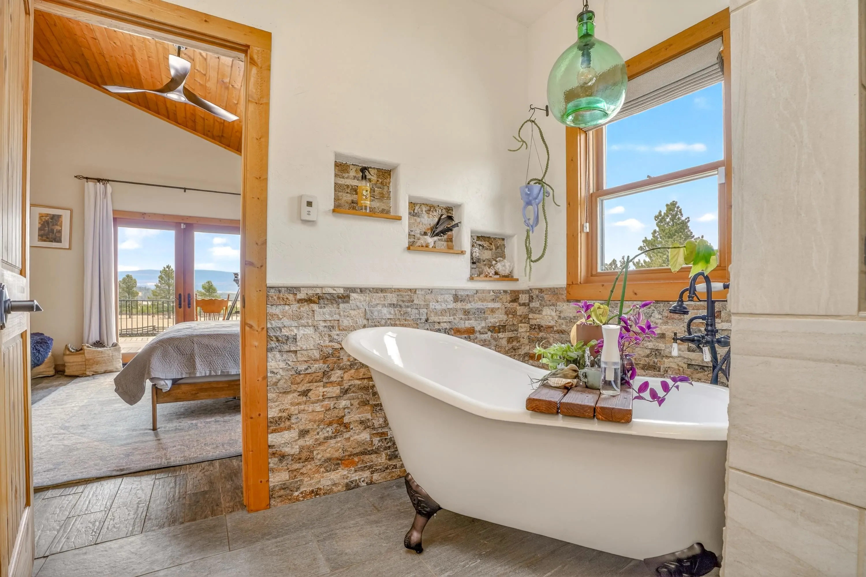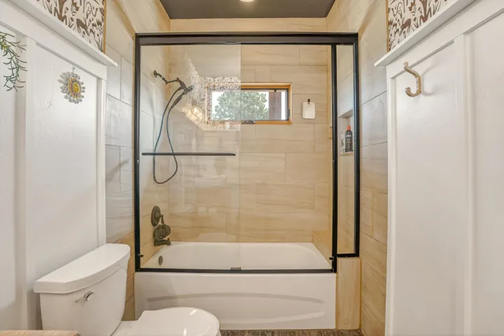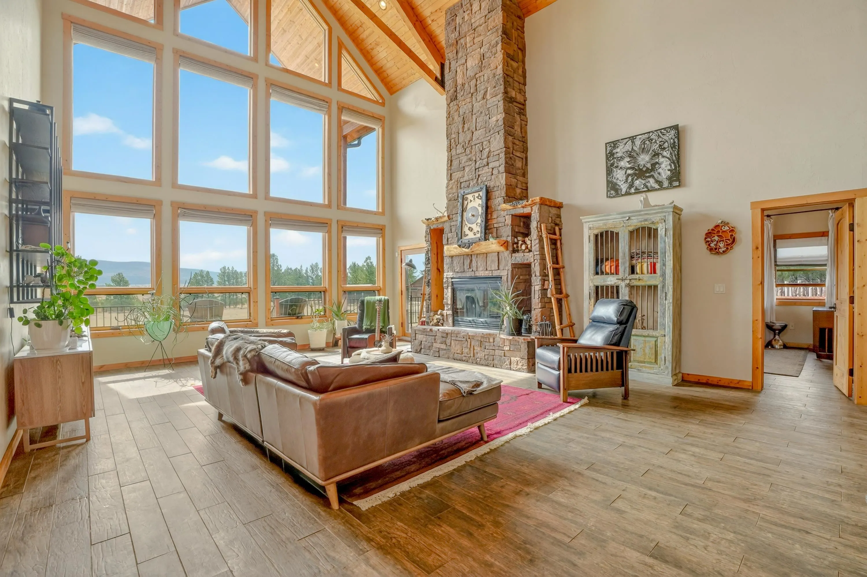 23 Acre Horse Property with Custom Home & Stunning Views Enjoy the perfect blend of mountain living and equestrian functionality just minutes from Angel Fire Resort. Set on 23 fully fenced, usable acres, this thoughtfully designed property offers privacy, open space with sweeping valley and mountain views—ideal for horse owners, outdoor enthusiasts or anyone seeking a peaceful year-round retreat. Entering through the handcrafted timber ranch gate and following the improved private driveway, you’ll find a beautiful custom-built home. Inside, travertine tile with marble inlay and in-floor radiant heat create a warm and inviting first impression. The open-concept living, kitchen and dining areas are filled with natural light from a dramatic wall of windows and anchored by a massive stone fireplace. Soaring 30-foot ceilings lead to a loft with expansive views, adding to the home’s spacious feel. The kitchen is both functional and refined, featuring Kenmore Elite appliances, a copper farmhouse sink, granite countertops, wormy maple accents and custom cabinetry. All three bedrooms are conveniently located on the main level, including a spacious primary suite with French doors opening to a covered deck. The ensuite bath offers a clawfoot soaking tub, walk-in shower and walk-in closet. The oversized 2-car garage also features in-floor radiant heat. Designed for equestrian use, the property is a fully equipped horse setup with steel pipe fencing, two 50’x50’ paddocks, cross-fenced pastures and hotwire fencing throughout. The 15’x35’ shed-row barn includes adjustable stalls (1–3), a Dutch-door tack and feed room with heat, on-demand propane hot water, utility sink, and electricity inside and out. A 15’x35’ overhang provides additional shelter, complemented by a hay barn with loft, water lines, electric access for trough heaters and a designated gated manure composting area. Additional property features include a 1,200 sq ft workshop with loft, water, and electricity, a dedicated RV pad with 30-amp service and multiple outbuildings offering flexibility for storage, hobbies, or future expansion. A newly added 2025 tiny house casita (1 bedroom, 1 bath plus loft) includes its own deck, outdoor fireplace, separate septic, electric, water, and fiber optic internet—ideal for guests or potential rental use. Recent upgrades include a new Generac whole-home generator (2025) connected to an owned 10,000-gallon underground propane tank, fire-wise tree thinning, new gutters and snow breaks, exterior re-staining, an updated laundry room, and extensive landscaping with native plants, drip irrigation, stone walkways and natural boulder accents. Offered fully furnished with no HOA or resort dues. This is a rare opportunity to own a turn key equestrian mountain property offering space, privacy, and exceptional versatility.