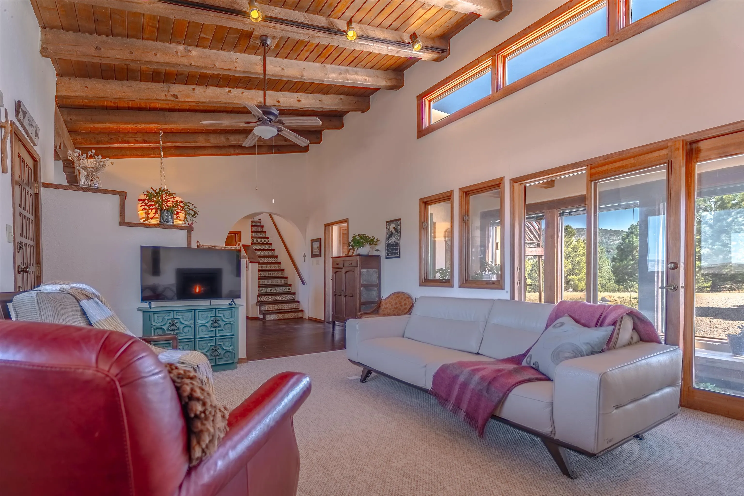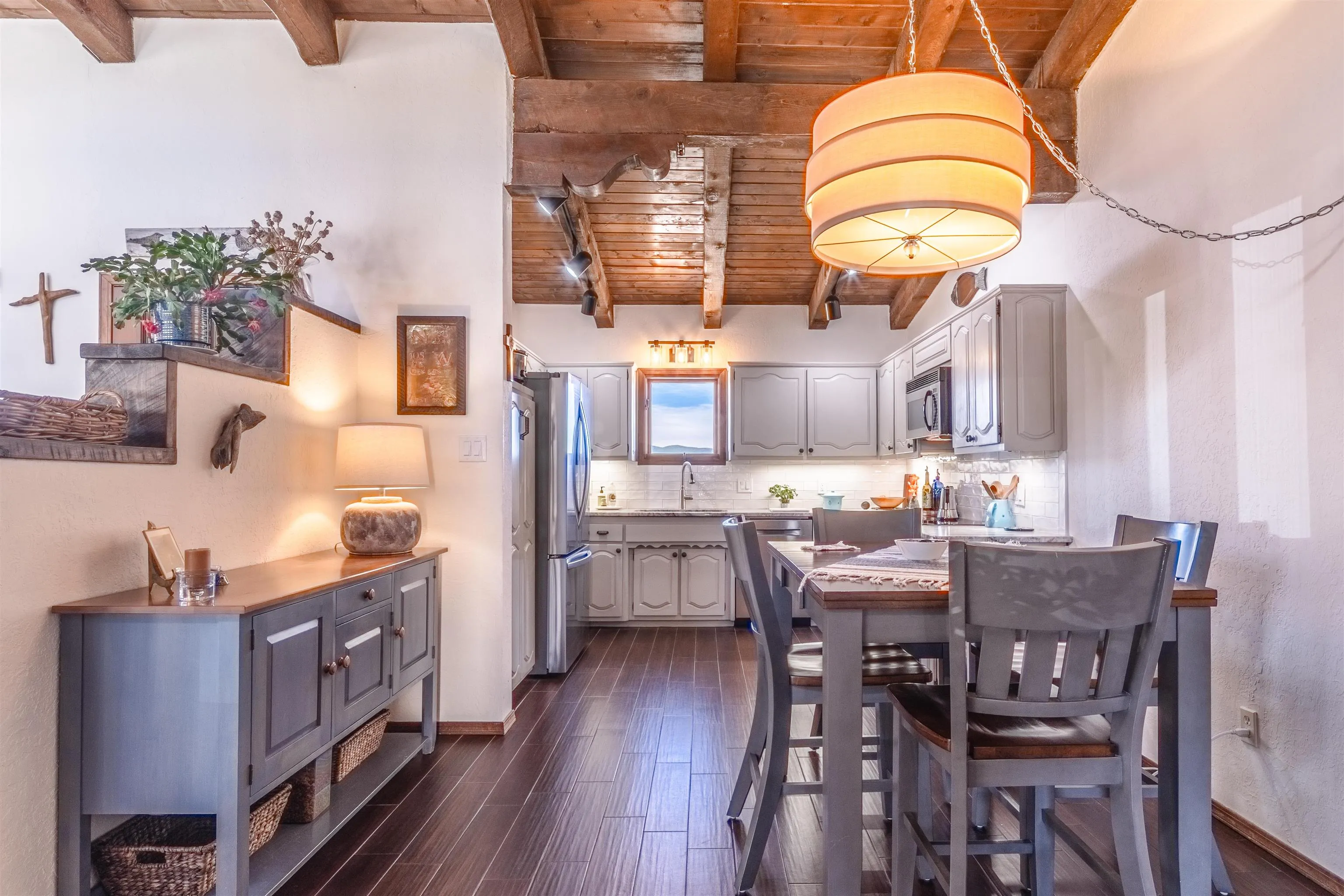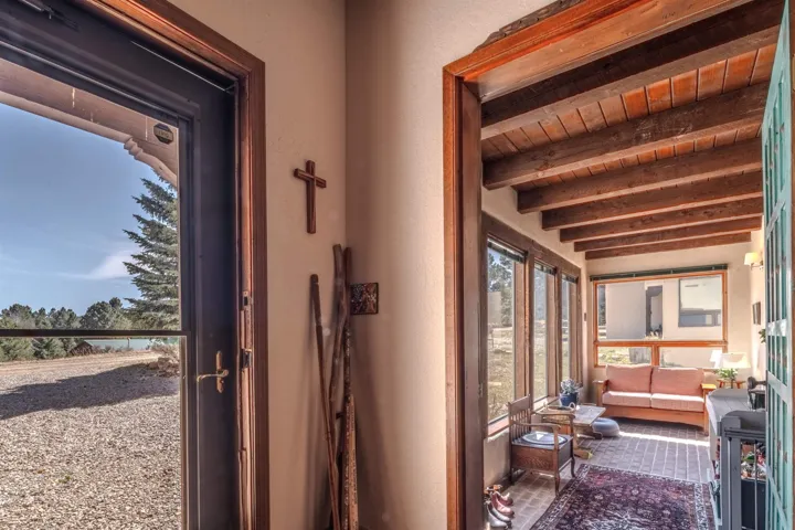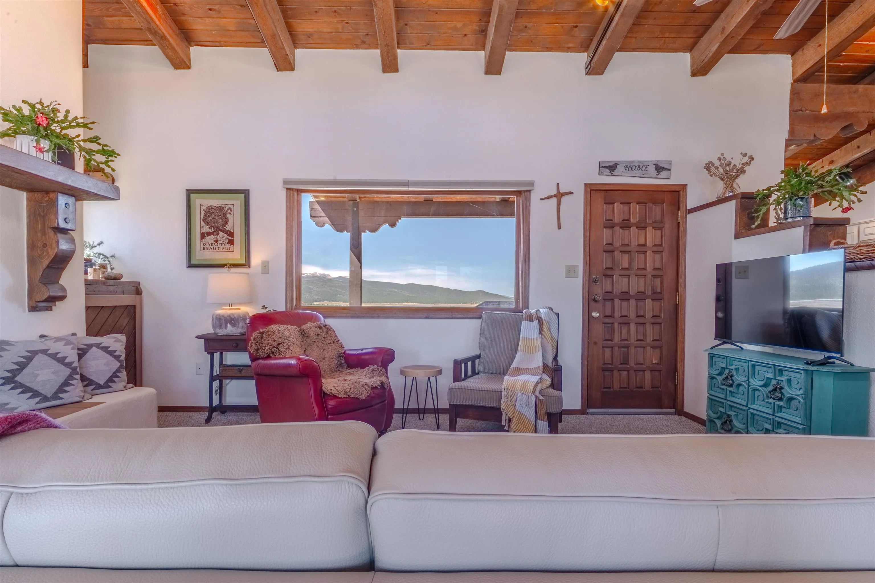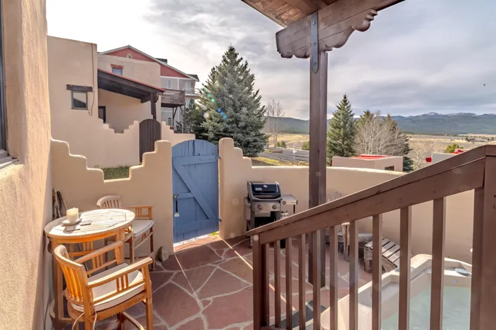 Tucked into the peaceful beauty of Angel Fire, 38 Sage Lane #2 feels less like a condo and more like a mountain townhome retreat—inviting, comfortable, and full of character. Located near the conveniences and adventures of Angel Fire Resort, yet outside the resort boundary, this home offers quiet mountain living without required annual membership dues. Inside, warm wood-look tile floors, classic vigas, and a light-filled sunroom create a true sense of place, while large windows frame beautiful views toward Wheeler Peak. The open living area flows seamlessly into the kitchen and dining space, making the home ideal for relaxed mornings, cozy evenings, and time shared with family and friends. Recent upgrades bring both style and peace of mind, including a new standing seam metal roof, new washer and dryer, and a new refrigerator. The fireplace features a recently added Lopi insert, complete with thermostat and remote, offering effortless warmth on winter days. Outside, a newly added stone patio and brand-new three-person hot tub create a special place to breathe in the mountain air and enjoy those signature Angel Fire skies. The thoughtful layout includes a spacious main-level guest bedroom and full bath, while the upstairs primary suite offers an ensuite bath with a recently re-tiled shower/tub combo and a charming bonus alcove—perfect for an office, creative space, or additional guests. With the Sage greenbelt trail beginning just outside the front door and connecting to miles of hiking and biking trails, this home is perfectly positioned for the Angel Fire lifestyle. Offered unfurnished and ready for your own art, style, and furnishings, Unit 2 at 38 Sage Lane is a rare find—spacious, comfortable, and full of mountain charm.