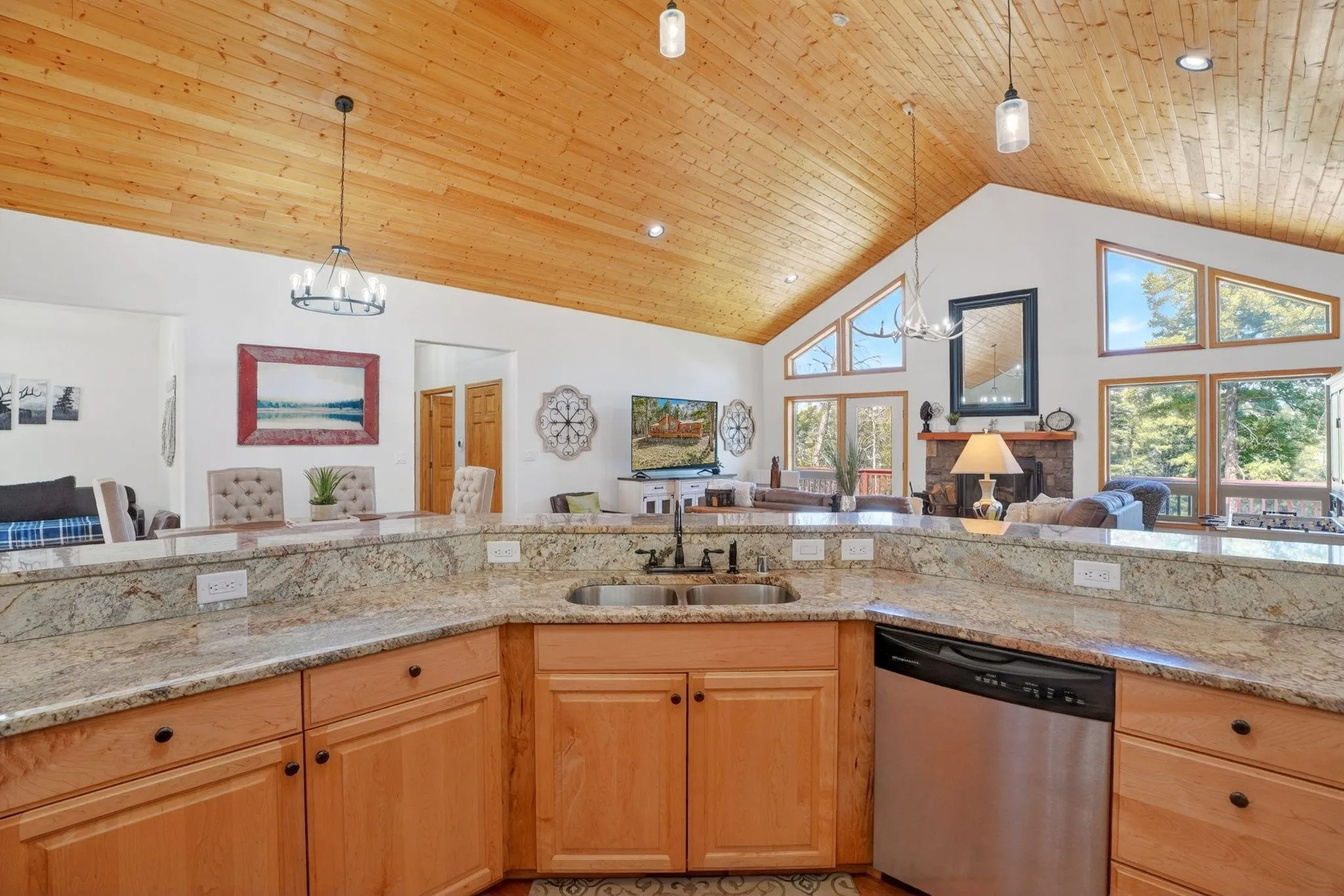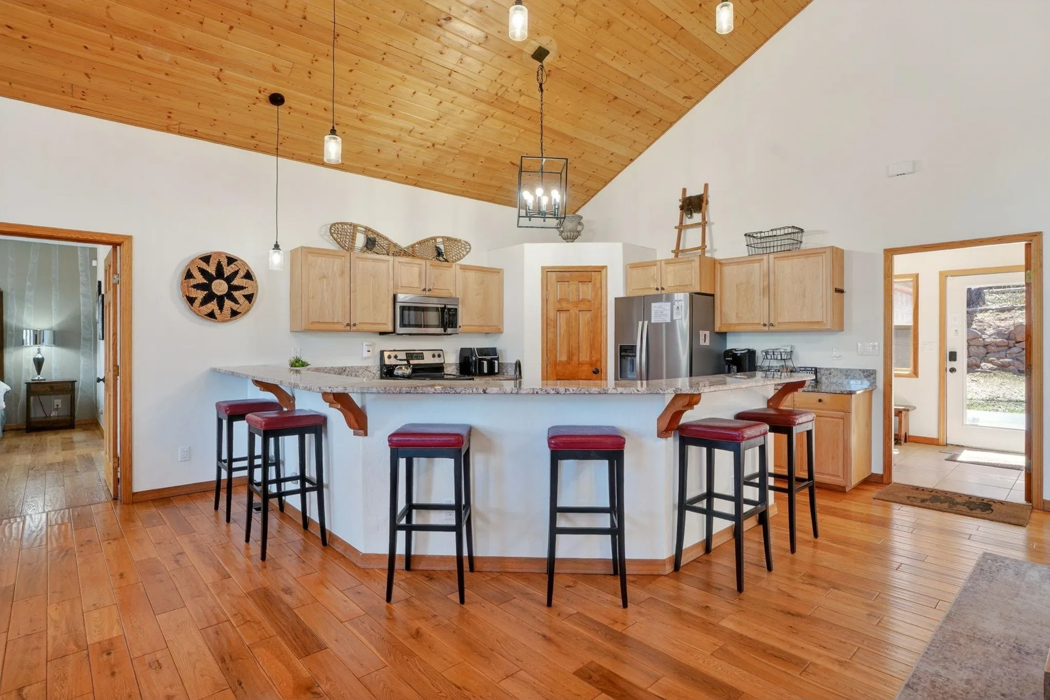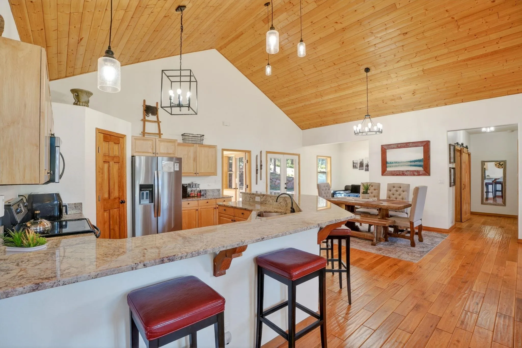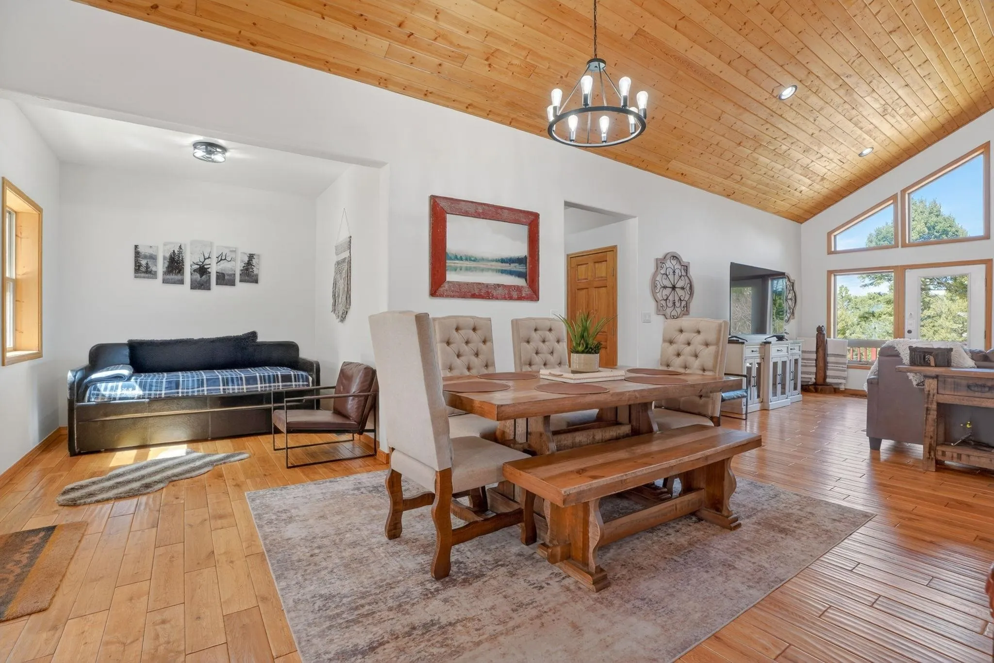 While the setting feels tucked away, 342 Back Basin is located on one of Angel Fire’s highest-priority roads, offering quick and easy access to the ski mountain, golf course, restaurants, and more. Designed for gathering, the home features an open-concept layout with vaulted wood ceilings, expansive windows, and a warm, inviting living area anchored by a stone fireplace. The kitchen flows seamlessly into the living and dining spaces, ensuring the cook is never far from the conversation. The true single-level layout is a rare and highly desirable find in Angel Fire, with no steps to enter, access the garage, or move throughout the home. Set apart from the main entry, a secondary entry space creates a natural landing zone for mountain living—whether you’re coming in from an adventure or stepping out to the hot tub. A bonus room, currently set up with a trundle daybed for extra guests, also works well as an office, library, or additional seating area. Outdoor living is just as compelling, with a spacious deck to the north and hot tub and grill areas to the south, creating multiple ways to enjoy the mountains throughout the day. The home has numerous recent updates, including a new roof, updated appliances, a hot tub, and furnishings, offering both comfort and peace of mind. Fully furnished and decorated, it’s ready to be enjoyed from day one.