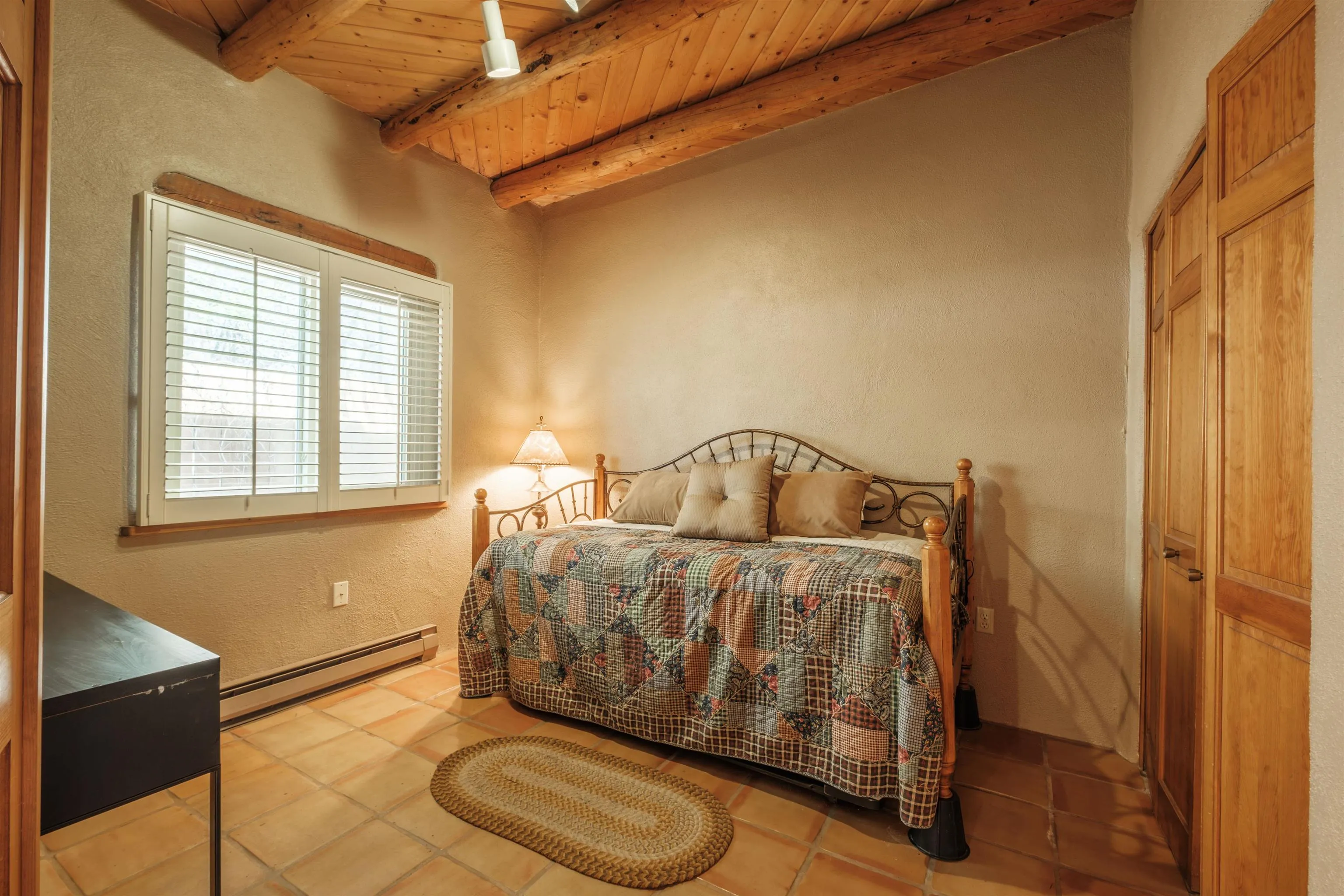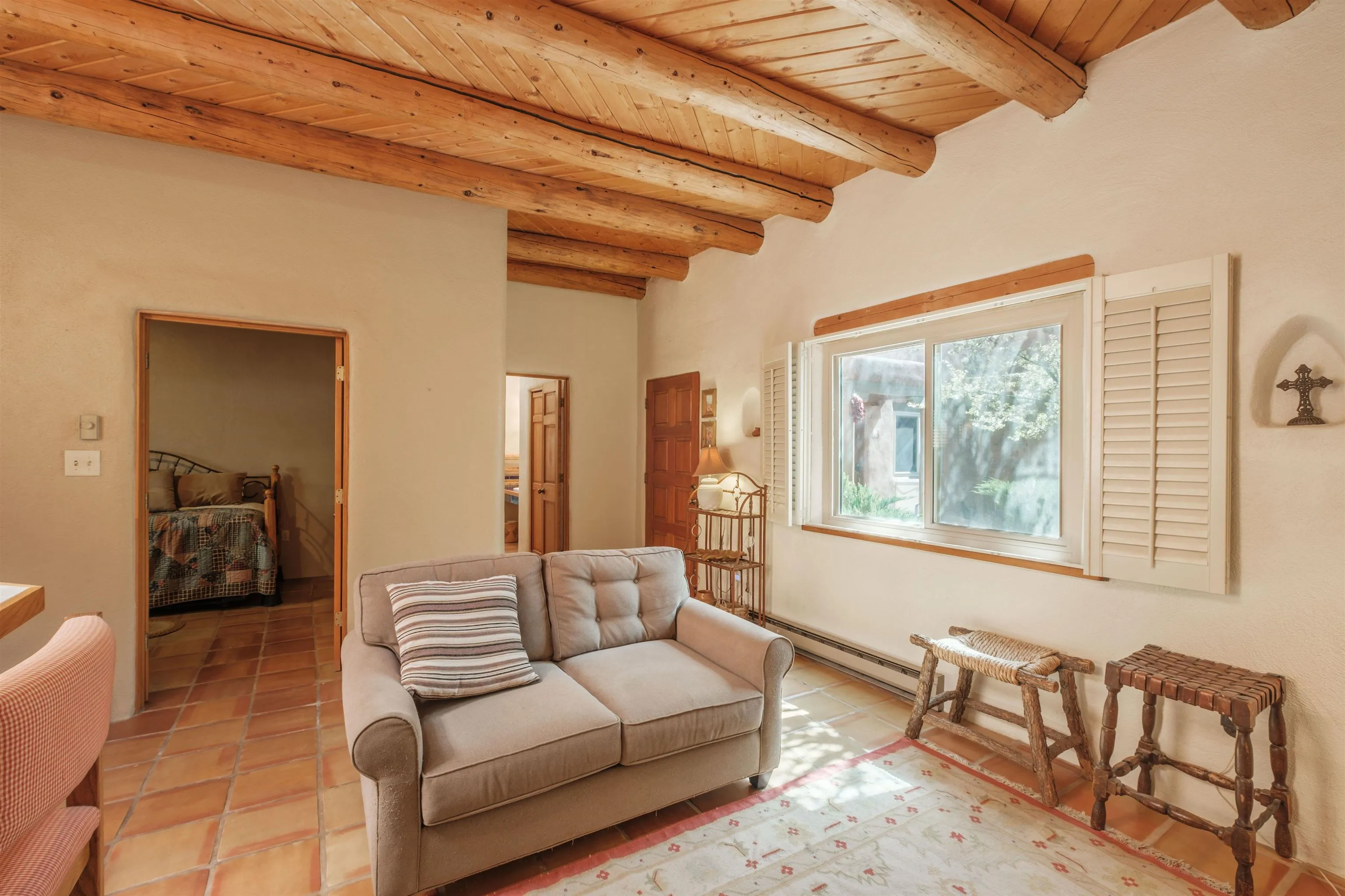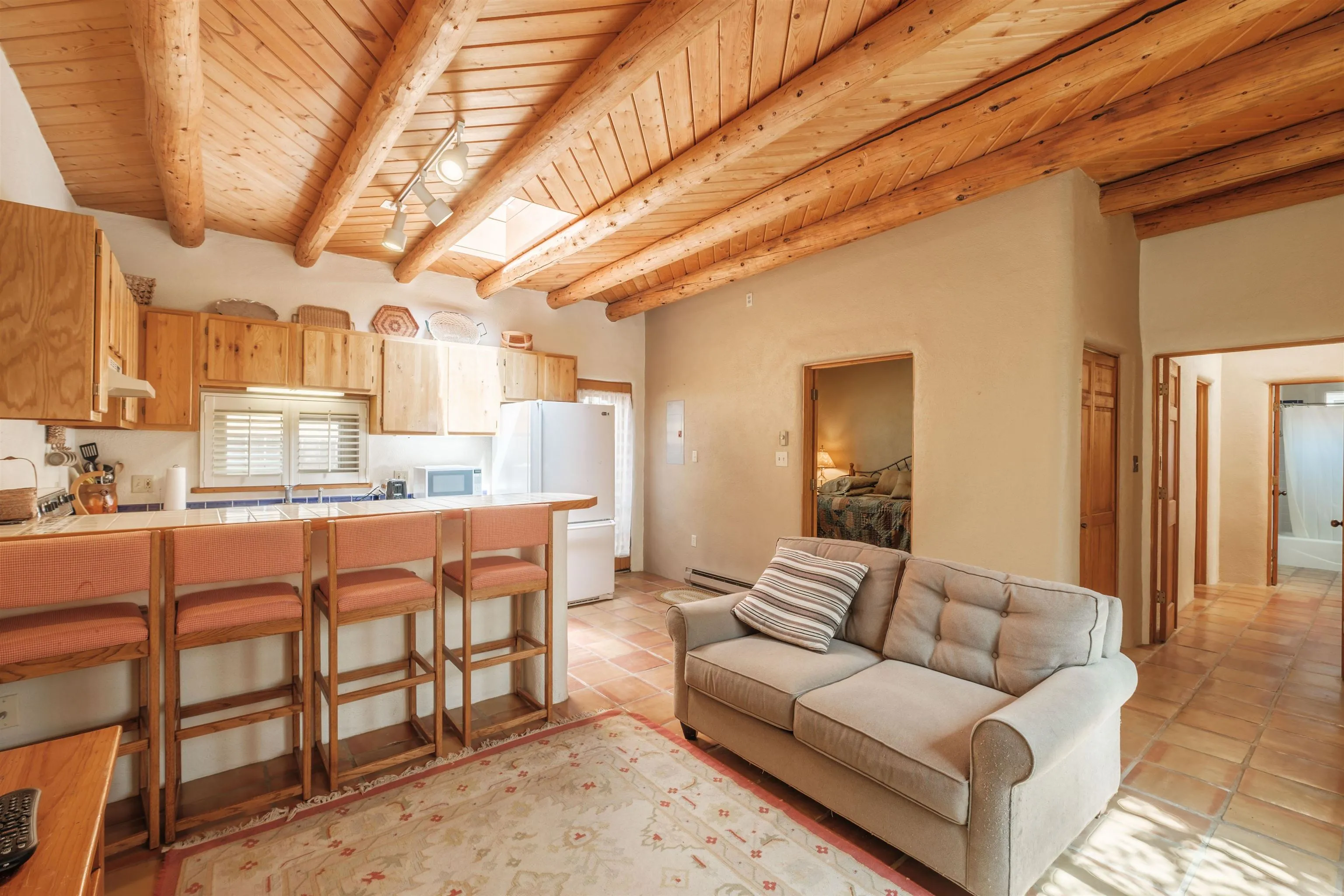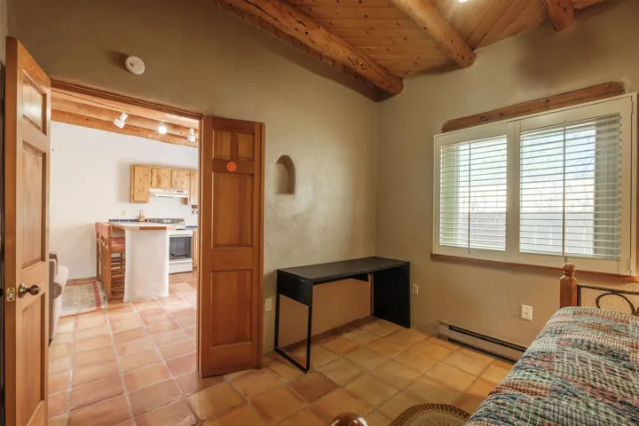 Lovely, Southwest style condo that is easy walking distance to historic Taos Plaza. La Buena Vida Condos are a comfortable, quiet complex with ample privacy behind gated walls. This unit is offered furnished and ready to move into. With two bedrooms, this condo is perfect for efficient living, weekend getaways or long term rental. Ample closets and a separate locking owners’ s storage unit make for uncluttered living spaces. This condo offers modern amenities like new windows and privacy blinds but with classic pueblo style details such as tile floors and hand hewn viga ceilings. La Buena Vida offers easy access to restaurants, shopping, coffee shops and nightlife around the Plaza. A short walk to Kit Carson Park makes this the perfect location for summer festival season.