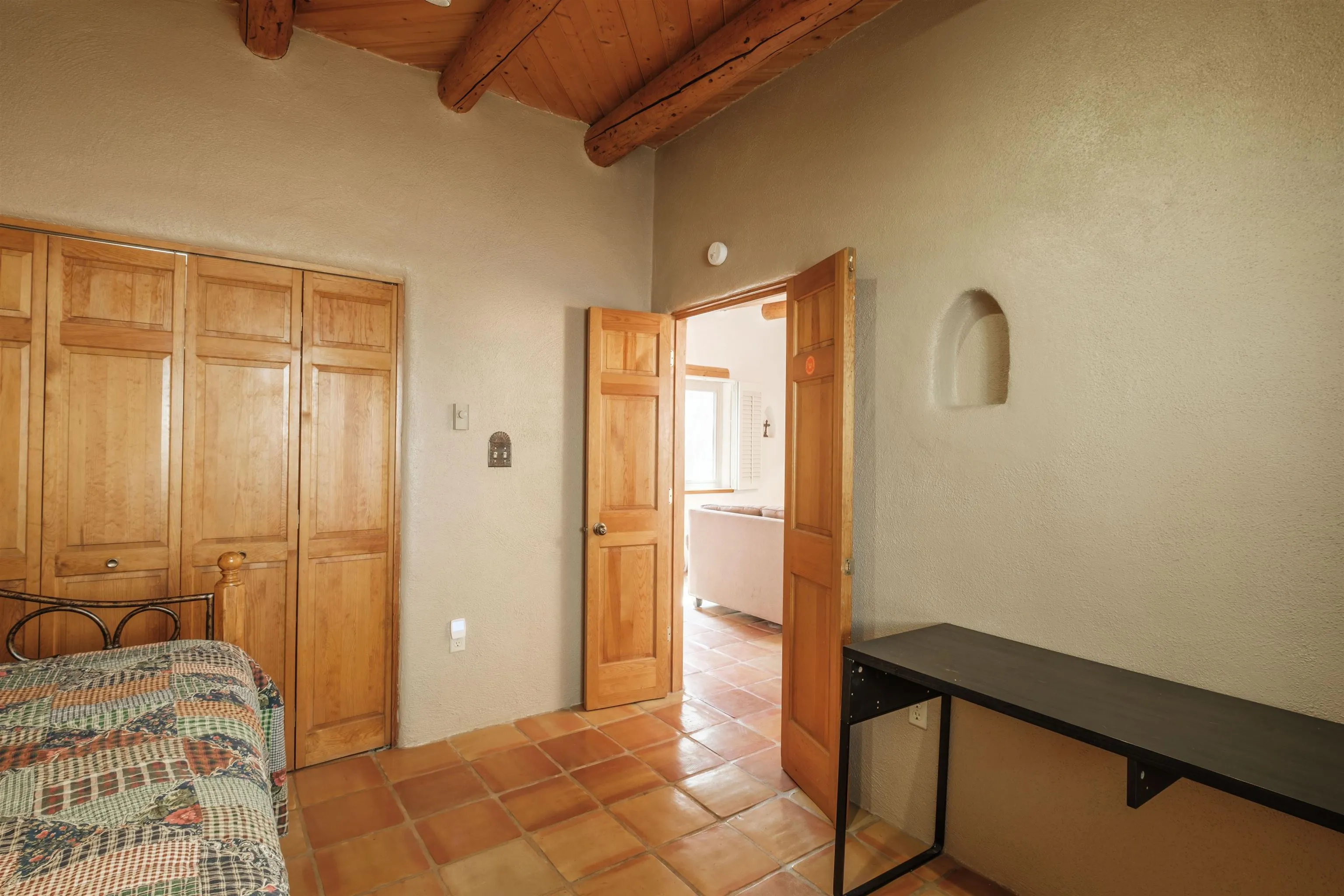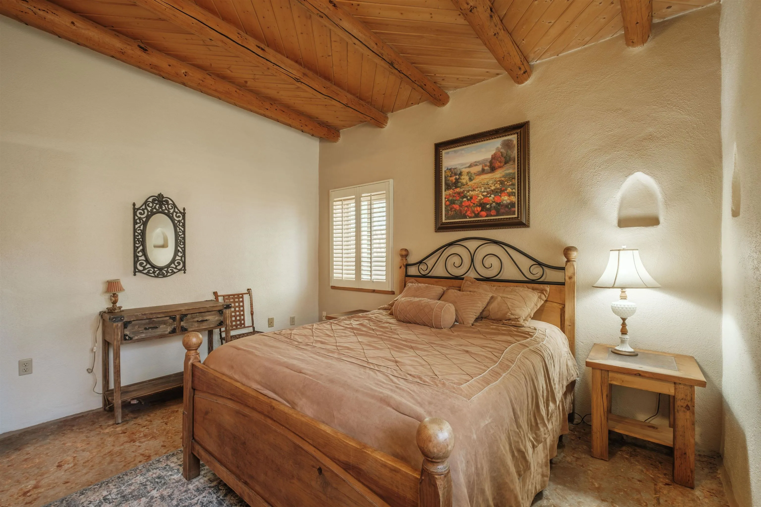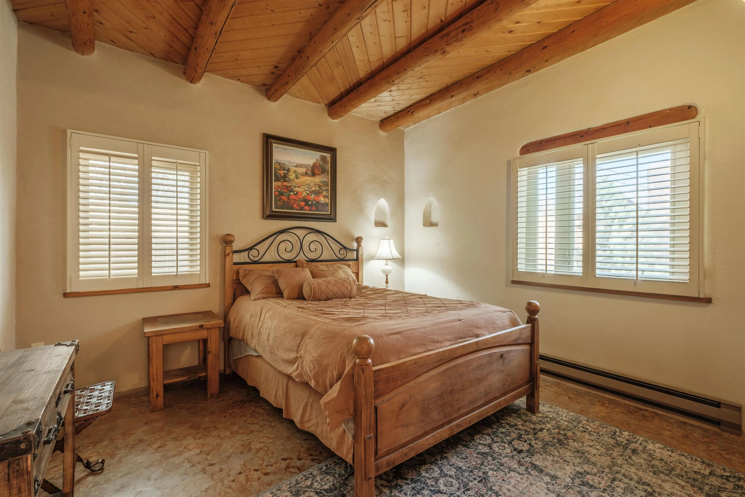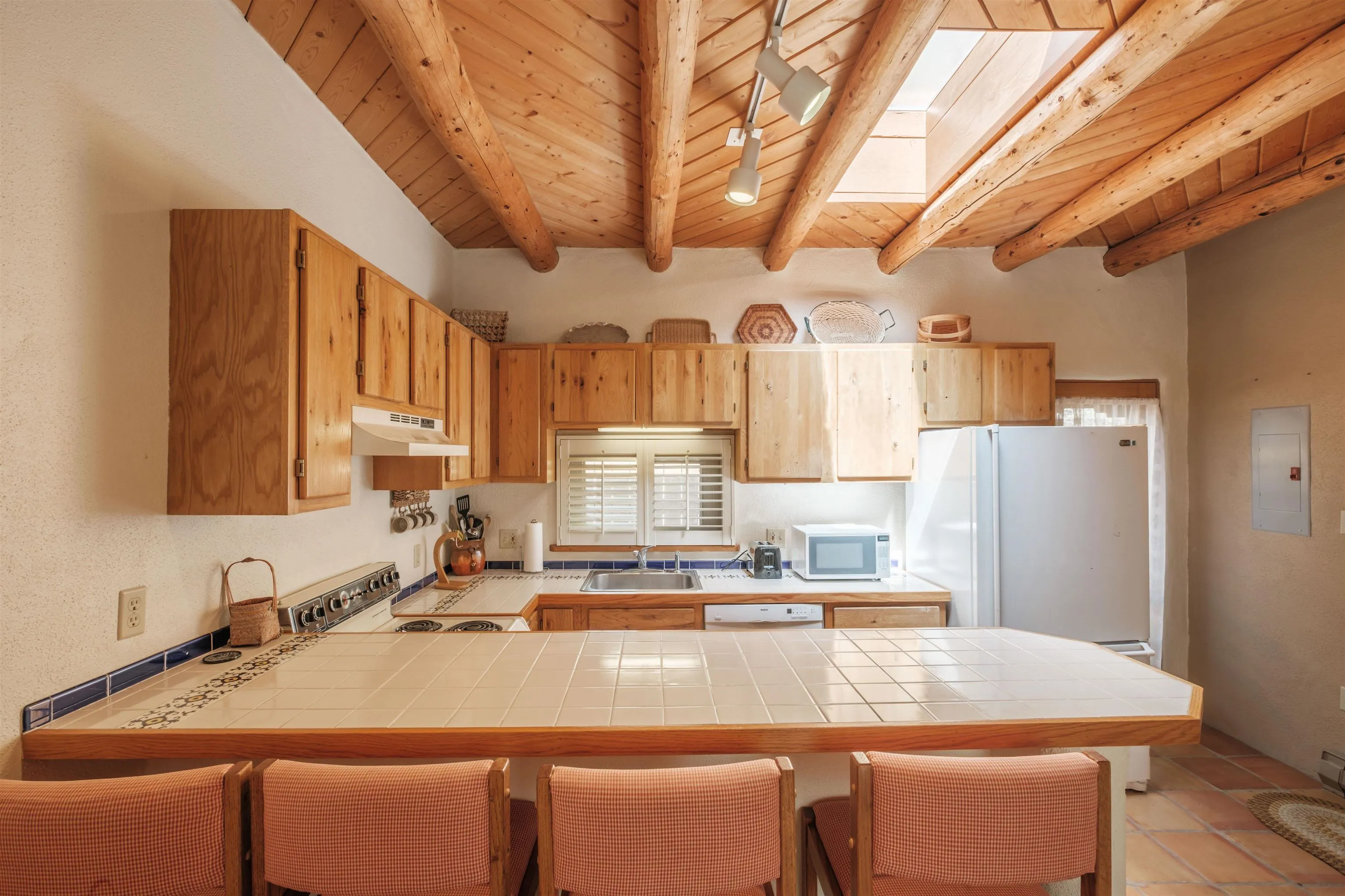 Lovely, Southwest style condo that is easy walking distance to historic Taos Plaza. La Buena Vida Condos are a comfortable, quiet complex with ample privacy behind gated walls. This unit is offered furnished and ready to move into. With two bedrooms, this condo is perfect for efficient living, weekend getaways or long term rental. Ample closets and a separate locking owners’ s storage unit make for uncluttered living spaces. This condo offers modern amenities like new windows and privacy blinds but with classic pueblo style details such as tile floors and hand hewn viga ceilings. La Buena Vida offers easy access to restaurants, shopping, coffee shops and nightlife around the Plaza. A short walk to Kit Carson Park makes this the perfect location for summer festival season.