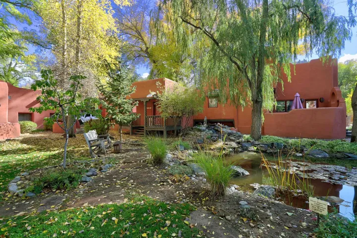 A Work of Art You Can Call Home! Tucked away and nestled amongst mature trees this tranquil and private oasis is truly a hidden treasure! Beautiful two story contemporary Northern NM style main home, guest house and studio at the end of a private road in the foothills.